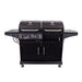 The Deluxe Gas and Charcoal Combo grill are great for those who love the experience and flavor of grilling with charcoal but also love the ease of grilling with gas. The deluxe combo grill offers great storage and workspace with the handle side shelf and two-door rolling cart. No matter how you want to grill the combo has you covered. It has 505 sq. in. gas grilling space and 505 sq. in. charcoal grilling space. The two-door cabinet is great for added storage. Easy to clean porcelain cooking grates are also rust-resistant. It has an adjustable height fire grate that controls heat by using a crank. It has a swing-a-way warming rack that swings back when you open the grill lid so you can easily reach the food you are cooking. It also has a charcoal grilling damper to control the temperature by opening and closing the dampers. There is a large pull out ash drawer that makes clean up really easy.