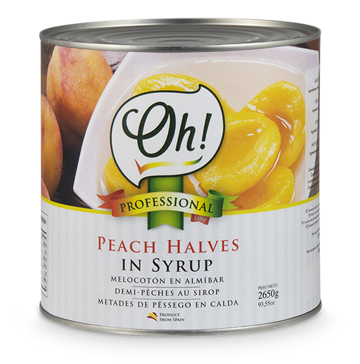 Canned peach halves in syrup, using ripe and healthy fruits from the Spanish fields. A delicious dessert.