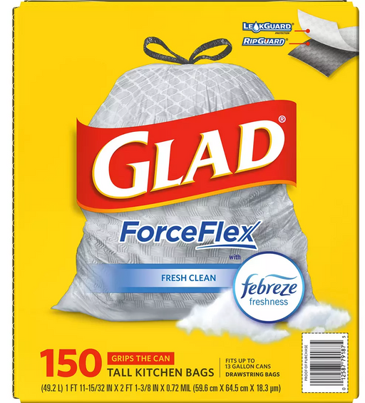 View full detailsGlad ForceFlex 13-Gallon Drawstring Trash Bags, 150 ct