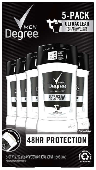 View full detailsDegree Men Ultra Clear Black + White Solid Antiperspirant Deodorant, 5-Pack, 5 x 2.7 oz