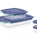 - Includes (1) 3 qt. oblong easy grab glass bakeware with blue lid, (1) 8" square easy grab glass bakeware with blue lid, (2) 1 cup round glass simply store with blue lids
